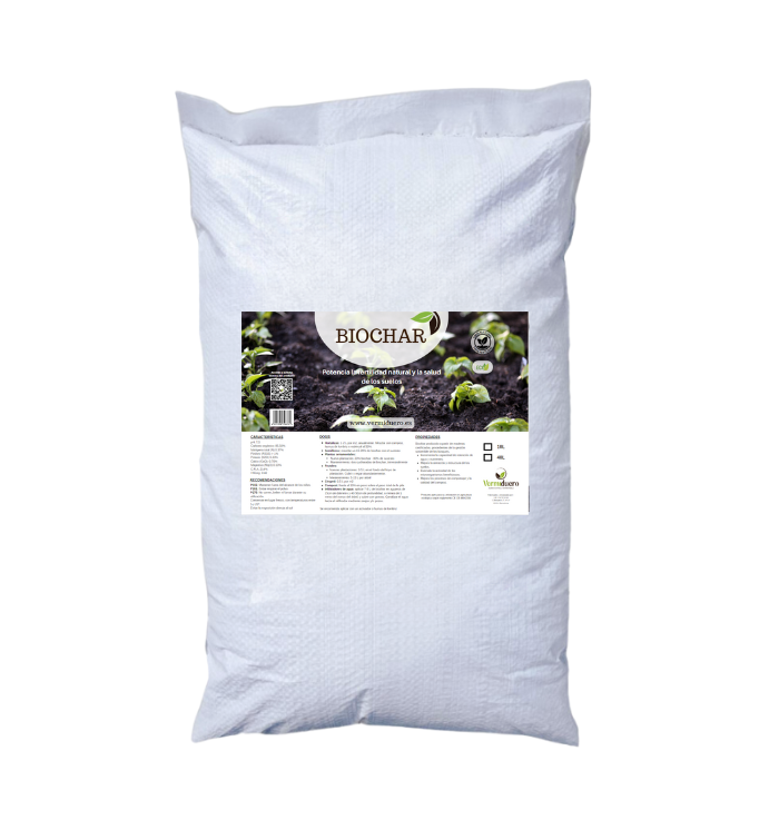 Es un material rico en carbono orgánico, muy poroso y estable, ideal para mejorar de forma duradera la fertilidad y la estructura del suelo.