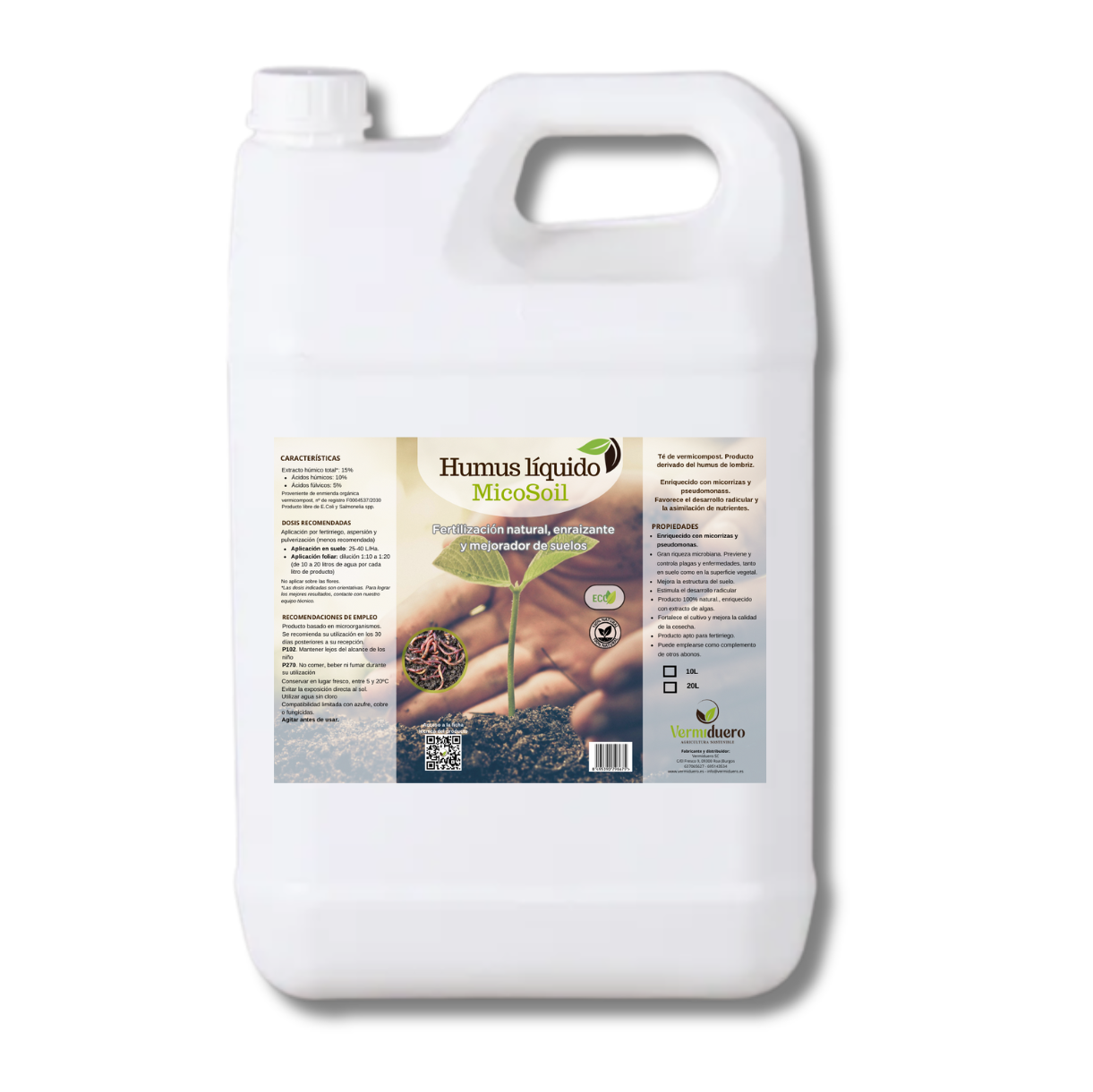 Humus líquido (té de vermicompost) enriquecido con micorrizas, extracto de algas y ácidos húmicos, que favorecen el desarrollo radicular, la absorción de agua y nutrientes y la protección frente a hongos patógenos de la raíz. Especialmente diseñado para aplicar al suelo en fertirriego.